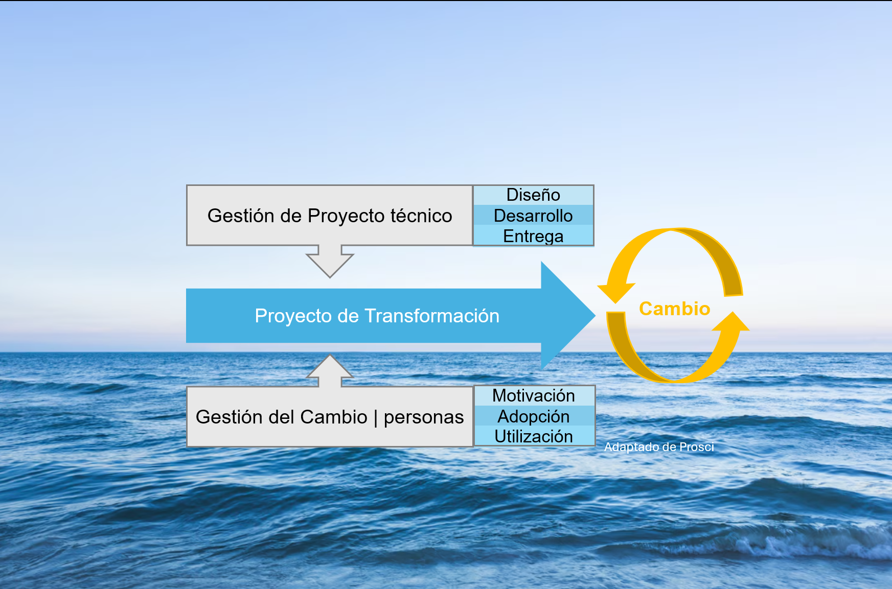Usamos una adaptación del modelo ADKAR de Prosci, modelo dinámico referente mundial basado en estudios científicos del comportamiento humano frente al cambio. El objetivo es conseguir una transición suave en la que todos los implicados estén convencidos y motivados para adoptar los cambios que se van a implementar, eliminando resistencias y miedos. ¿Y porqué dinámico? Porque somos humanos y no máquinas. Y por ello por el camino es posible que tengamos que volver sobre nuestros pasos para trabajar resistencias y miedos e impulsarnos de nuevo.